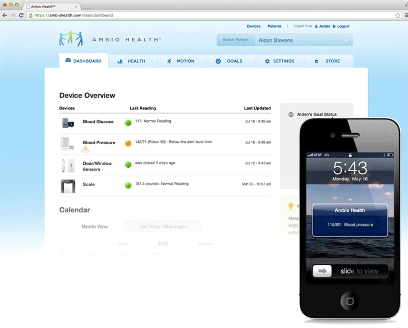 Ambio Health provides the patient with the convenience of obtaining readings using compatible blood pressure monitors, glucose meters, and scales from the comfort of their own home. Ambio’s wireless connectors automatically send the readings to the Ambio Care Portal where users can track their health, compare their readings against predefined thresholds, and view a detailed record of their data.