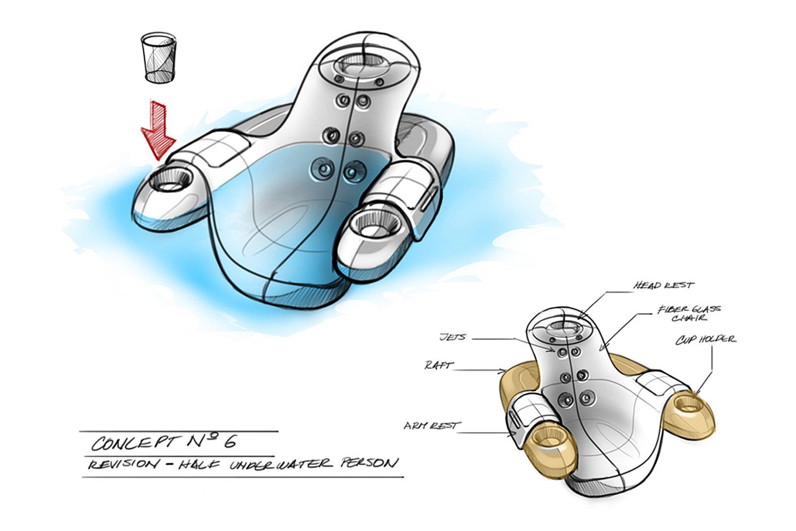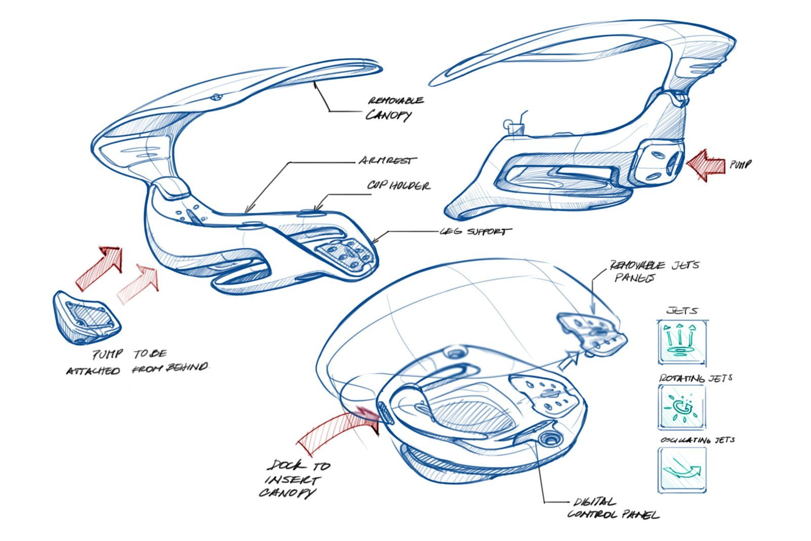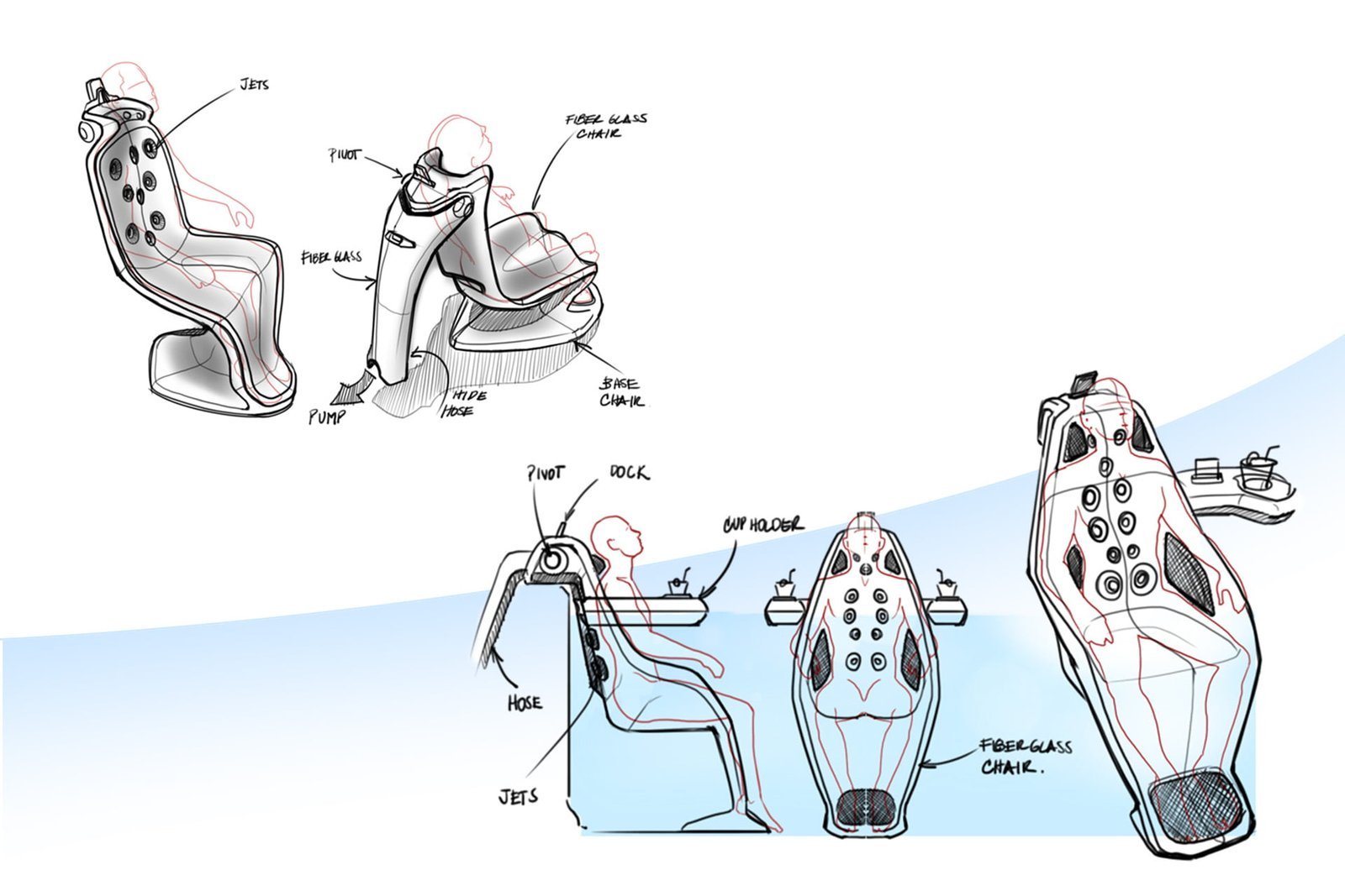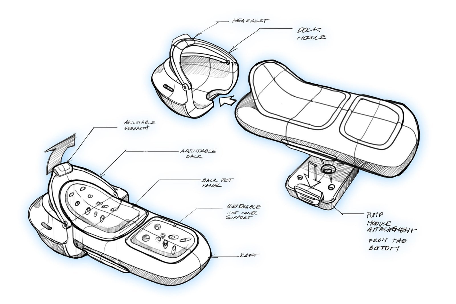 Concept sketches.Concept sketches and brainstorming for an ergonomic water therapy unit.
